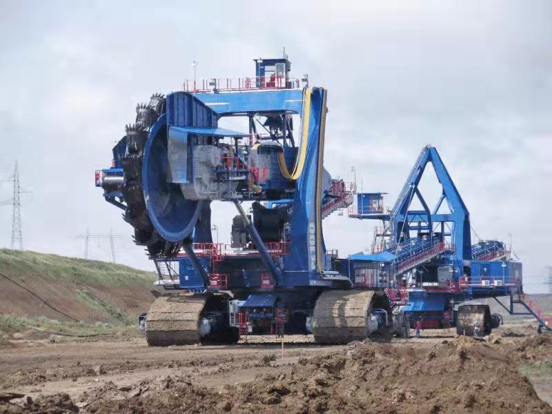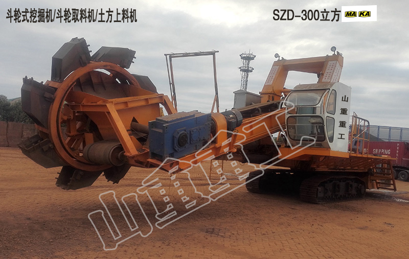 履帶行走斗輪式挖掘機/斗輪取料機是一種利用裝于動臂前端轉(zhuǎn)輪上的多個鏟斗連續(xù)挖掘的多斗挖掘機。用于大量土方的挖掘、 礦場的剝離和采掘以及大型料場的裝卸作業(yè),生產(chǎn)率高、挖掘力較大,可直接挖掘較堅硬的土壤。在大型建筑、水利工程和礦場中,常與運輸設(shè)備等配套,組成連續(xù)作業(yè)線。斗輪挖掘機按生產(chǎn)率或機重分小型、中型、大型、特大型和巨型。大型以上斗輪挖掘機挖掘力大,常用于采礦。輪斗挖掘機是在鏈斗挖掘機、單斗挖掘機和其它采掘設(shè)備的基礎(chǔ)上逐步發(fā)展起來的,是目前連續(xù)化作業(yè)設(shè)備中比較理想的一種多斗挖掘設(shè)備,也是目前世界上最大成套挖掘設(shè)備之一。